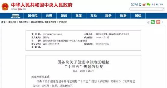 2016年12月23日,國(guó)務(wù)院下發(fā)《關(guān)于促進(jìn)中部地區(qū)崛起“十三五”規(guī)劃的批復(fù)》(國(guó)函〔2016〕204號(hào))。