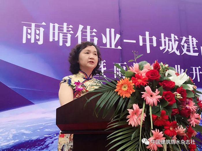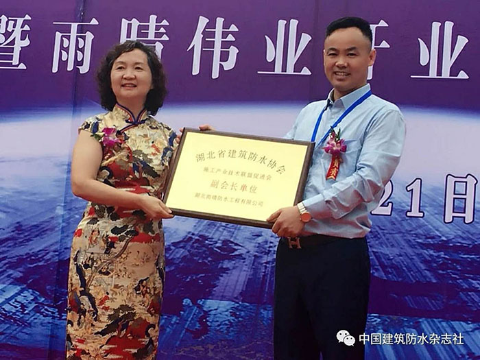 隨后,湖北防水協(xié)會會長桂春芳女士代表湖北防水協(xié)會在開業(yè)慶典大會上發(fā)表重要講話,她對湖北雨晴由最開始的施工企業(yè)轉(zhuǎn)型為防水系統(tǒng)服務(wù)商的工程進行了簡要介紹,并對之前雨晴承接的眾多國家大型、重點項目的防水工程予以肯定,并對雨晴在湖北乃至華中地區(qū)較高知名度,美譽度,影響力予以了肯定。她還說:當前,高質(zhì)量發(fā)展是新時代的要求,也是防水行業(yè)新時代的使命,并希望雨晴集團在產(chǎn)品質(zhì)量、工程質(zhì)量和服務(wù)質(zhì)量的管理上進一步做深做透做細,日益精進。心無旁騖造產(chǎn)品、一絲不茍干工程、全心全意做服務(wù),使雨晴集團快速進入高質(zhì)量高效益發(fā)展的康莊大道。之后授予雨晴公司“湖北省建筑防水協(xié)會施工產(chǎn)業(yè)技術(shù)聯(lián)盟促進會副會長單位”。